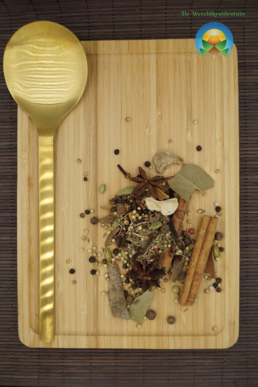 laurierblad, kruidnagel, kardemom, korianderzaad, zwarte peperkorrels, steranijs, mosterdzaad, komijnzaad, rozemarijn, tijm, pimentkorrels, kaneelstokjes
