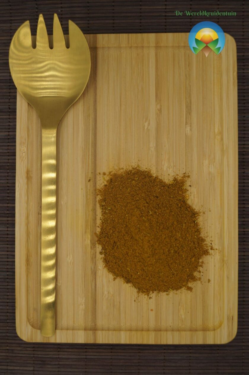 koriander, komijn, kruidnagel, kurkuma, knoflookpoeder, uienpoeder, zwarte peper, saffraanpoeder