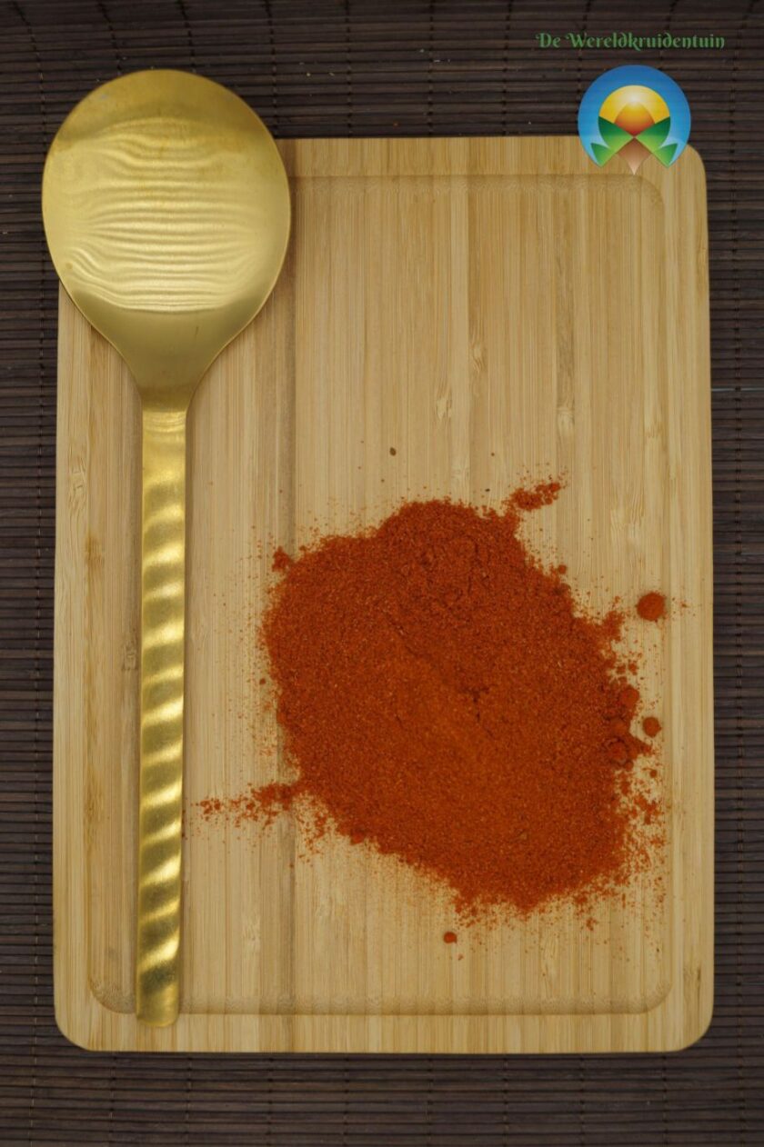 Ingrediënten: Zoete paprika gemalen, koriander gemalen, gember gemalen, komijn gemalen, knoflookpoeder, kurkumapoeder